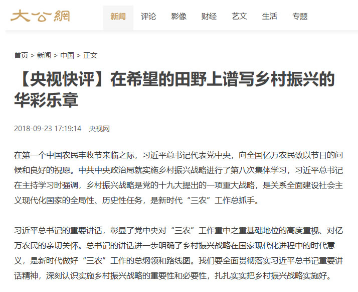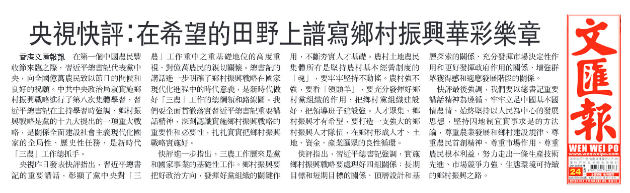 央視網(wǎng)消息:9月23日至24日,香港《文匯報》和香港《大公報》網(wǎng)站轉(zhuǎn)發(fā)了中央廣播電視總臺央視新聞23日刊播的《央視快評:在希望的田野上譜寫鄉(xiāng)村振興的華彩樂章》。報道內(nèi)容如下: