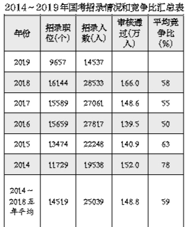 據(jù)華圖教育統(tǒng)計(jì),從2014-2018年國考報名平均審核通過人數(shù)為148.8萬,今年招錄人數(shù)1.45萬,如果按照平均審核通過人數(shù)計(jì)算,意味著今年的競爭比將會達(dá)到97.4:1,為歷年最高,堪稱最難國考年。