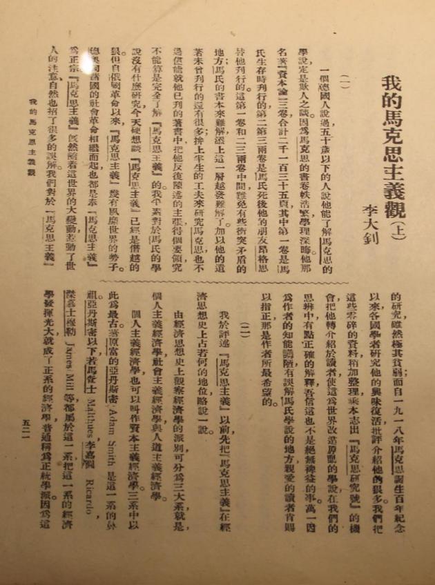 1919年,李大釗在《新青年》第6卷第5號(hào)發(fā)表《我的馬克思主義觀》一文,極大地推動(dòng)了馬克思主義在中國的研究與傳播。