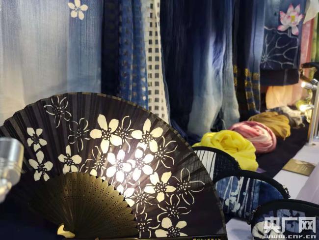 參展的藍(lán)染布藝展品。 (央廣網(wǎng)記者 杜蘇閩 攝)
