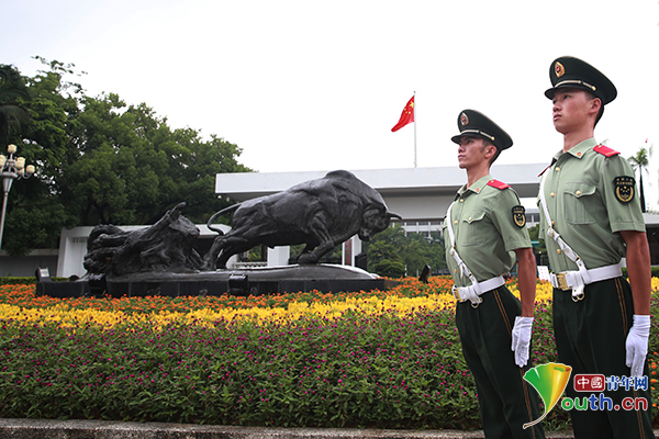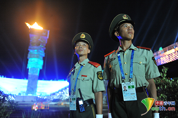 主火炬的光照亮了執(zhí)勤官兵滿是汗的臉龐,盡管一轉頭就能看到,但是他們始終堅守崗位,眼里只有警戒區(qū)域的安全。武警廣東總隊深圳支隊供圖