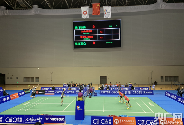 首場男雙比賽,廈門組合劉成/韓呈愷開局進入狀態(tài)較慢,失誤較多,一度以1:4落后深圳組合梁偉鏗/肖世程,而后逐漸找回手感,以15比13、15比11直落兩局擊敗深圳組合梁偉鏗/肖世程,拿下一分。