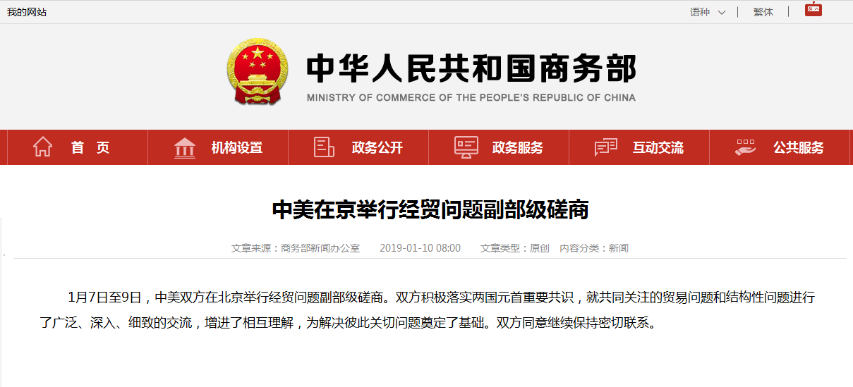 商務(wù)部聲明:1月7日至9日,中美雙方在北京舉行經(jīng)貿(mào)問題副部級(jí)磋商。雙方積極落實(shí)兩國元首重要共識(shí),就共同關(guān)注的貿(mào)易問題和結(jié)構(gòu)性問題進(jìn)行了廣泛、深入、細(xì)致的交流,增進(jìn)了相互理解,為解決彼此關(guān)切問題奠定了基礎(chǔ)。