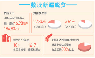 黨的十八大以來,新疆維吾爾自治區(qū)認(rèn)真貫徹落實(shí)習(xí)近平總書記關(guān)于扶貧工作的重要論述,把打好精準(zhǔn)脫貧攻堅(jiān)戰(zhàn)作為推動(dòng)黨中央治疆方略落地生根、實(shí)現(xiàn)新疆社會(huì)穩(wěn)定和長治久安總目標(biāo)的關(guān)鍵舉措,走出了一條具有新疆特色的脫貧攻堅(jiān)之路。確定南疆四地州22個(gè)深度貧困縣及所轄192個(gè)深度貧困鄉(xiāng)鎮(zhèn)、1962個(gè)深度貧困村和162.75萬貧困人口,將其作為脫貧攻堅(jiān)的重中之重、堅(jiān)中之堅(jiān)。大力實(shí)施特色產(chǎn)業(yè)帶動(dòng)、轉(zhuǎn)移就業(yè)、易地扶貧搬遷、突破瓶頸制約等8個(gè)專項(xiàng)行動(dòng);圍繞新疆社會(huì)穩(wěn)定和長治久安,實(shí)施邊境扶貧、基層基礎(chǔ)建設(shè)兩個(gè)專項(xiàng)行動(dòng)。發(fā)揮貧困群眾主體作用,常態(tài)化開展感恩教育、民族團(tuán)結(jié)聯(lián)誼等活動(dòng),深入推進(jìn)“去極端化”教育,破除“等靠要”思想。