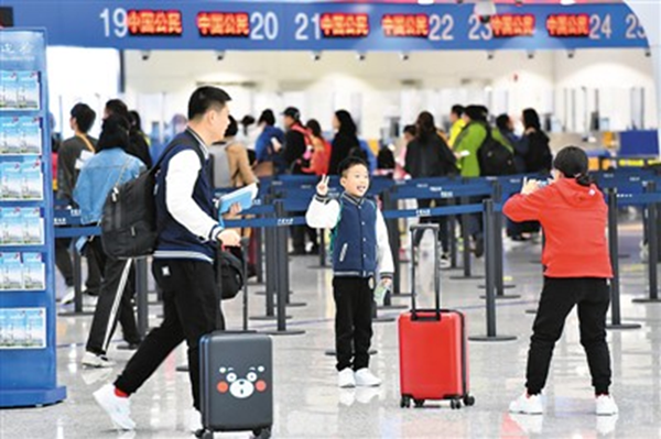 準(zhǔn)備出境旅游的市民正在廣州白云機(jī)場(chǎng)通關(guān)。新華社記者 劉大偉 攝
