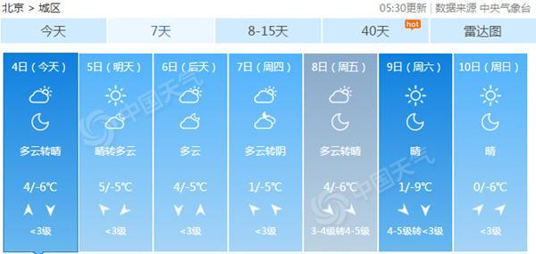 北京市氣象臺預計,今天將迎來一個晴朗的除夕,氣溫有所下降,但風力減小,體感并不會比昨天寒冷,最高氣溫4°C,最低氣溫-6°C。這樣的晴天將持續(xù)到明天,最高氣溫為5°C,最低氣溫-5°C。