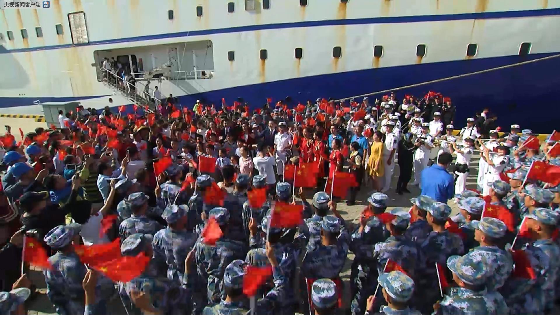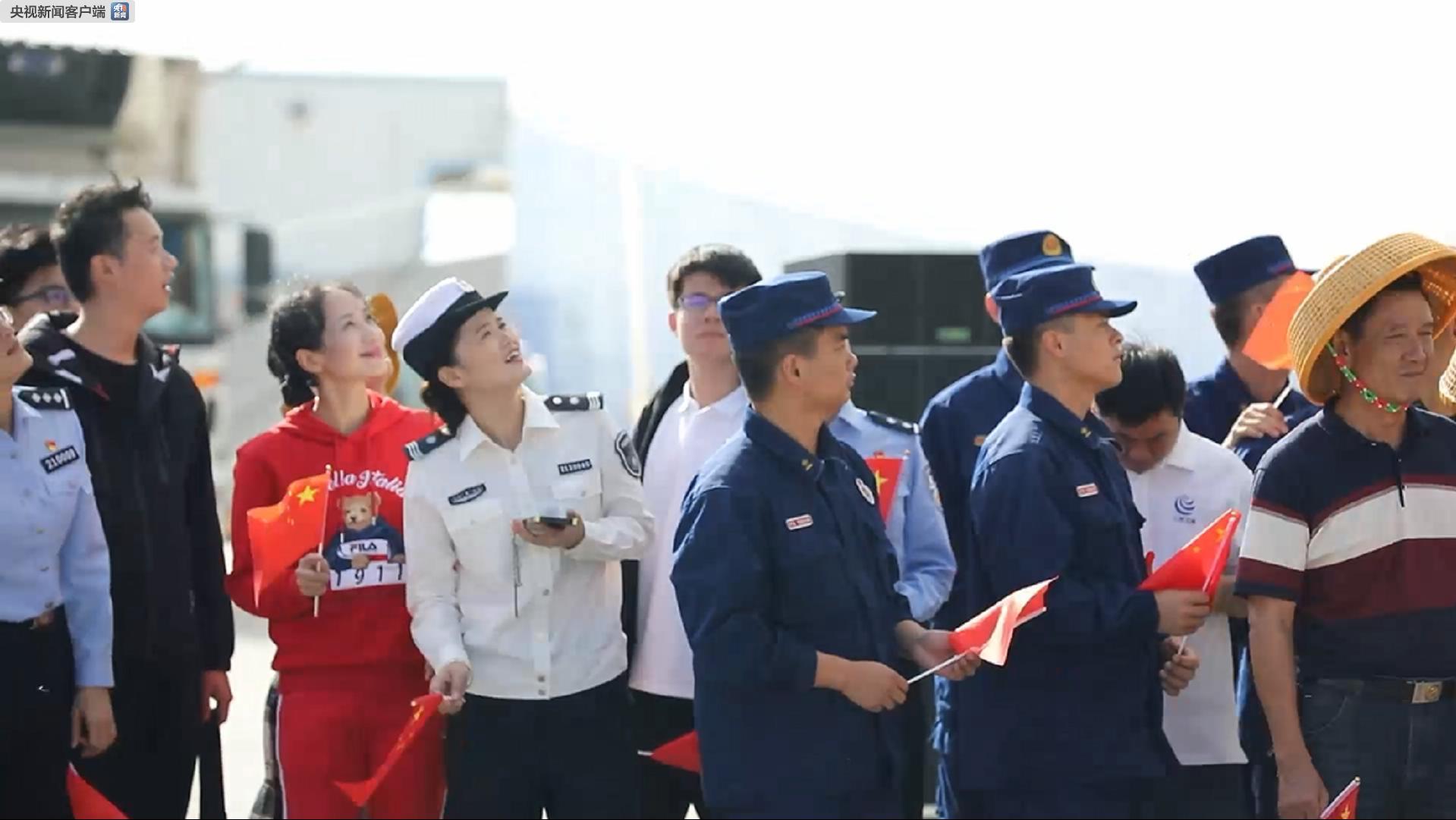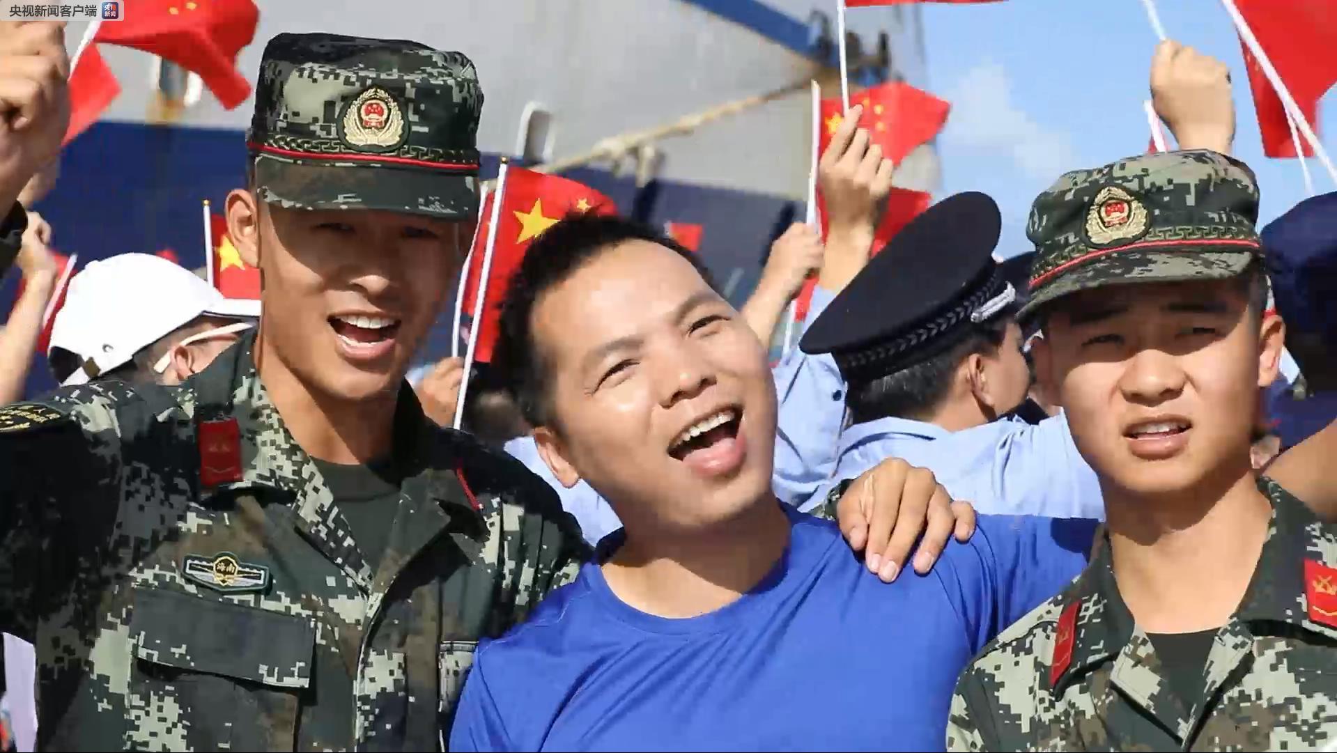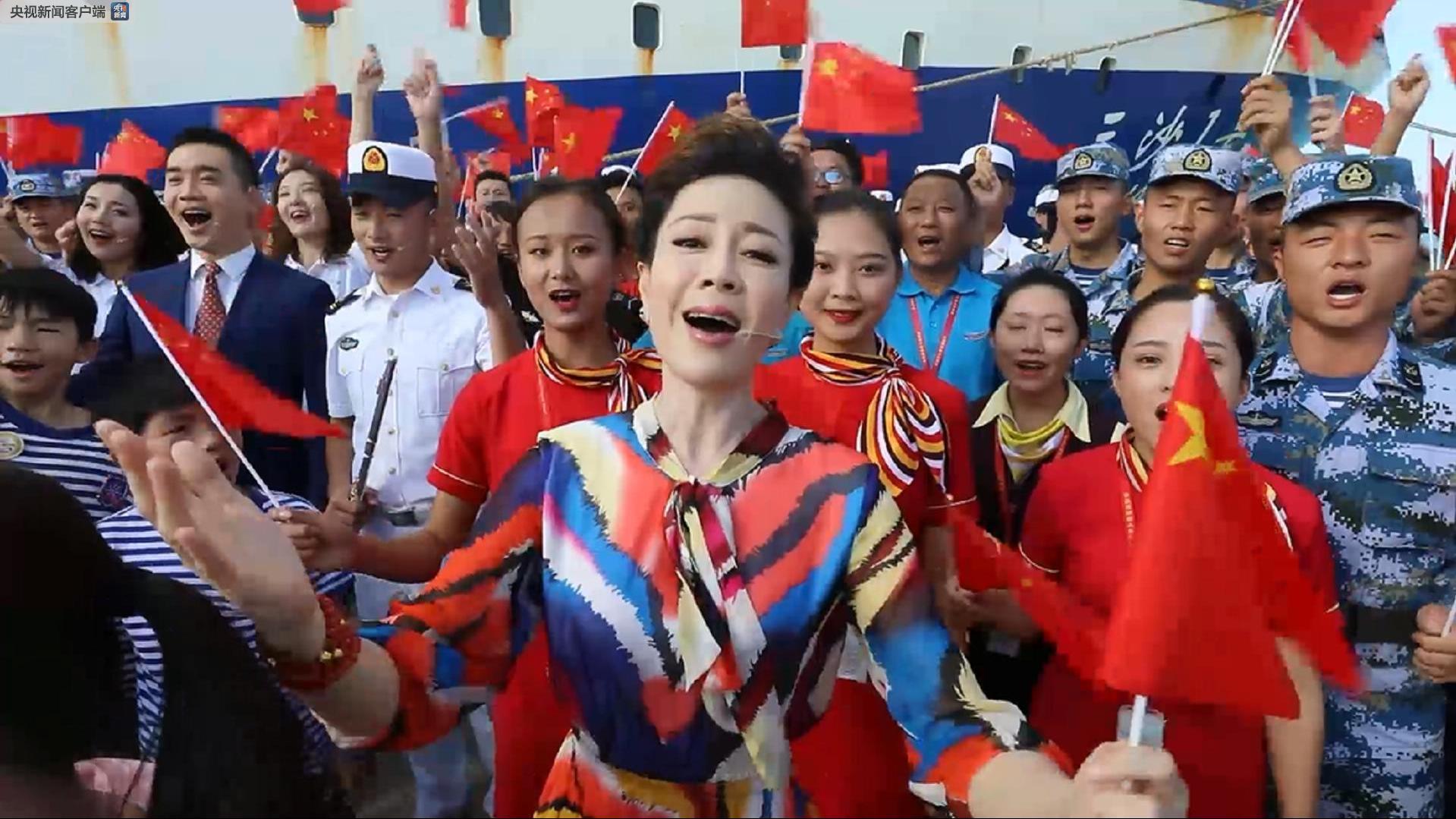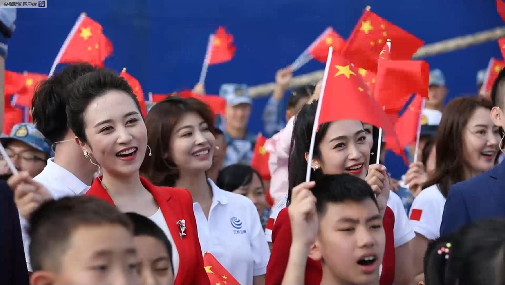 △三沙市工作人員、漁民和駐市部隊官兵揮舞著國旗,加入合唱