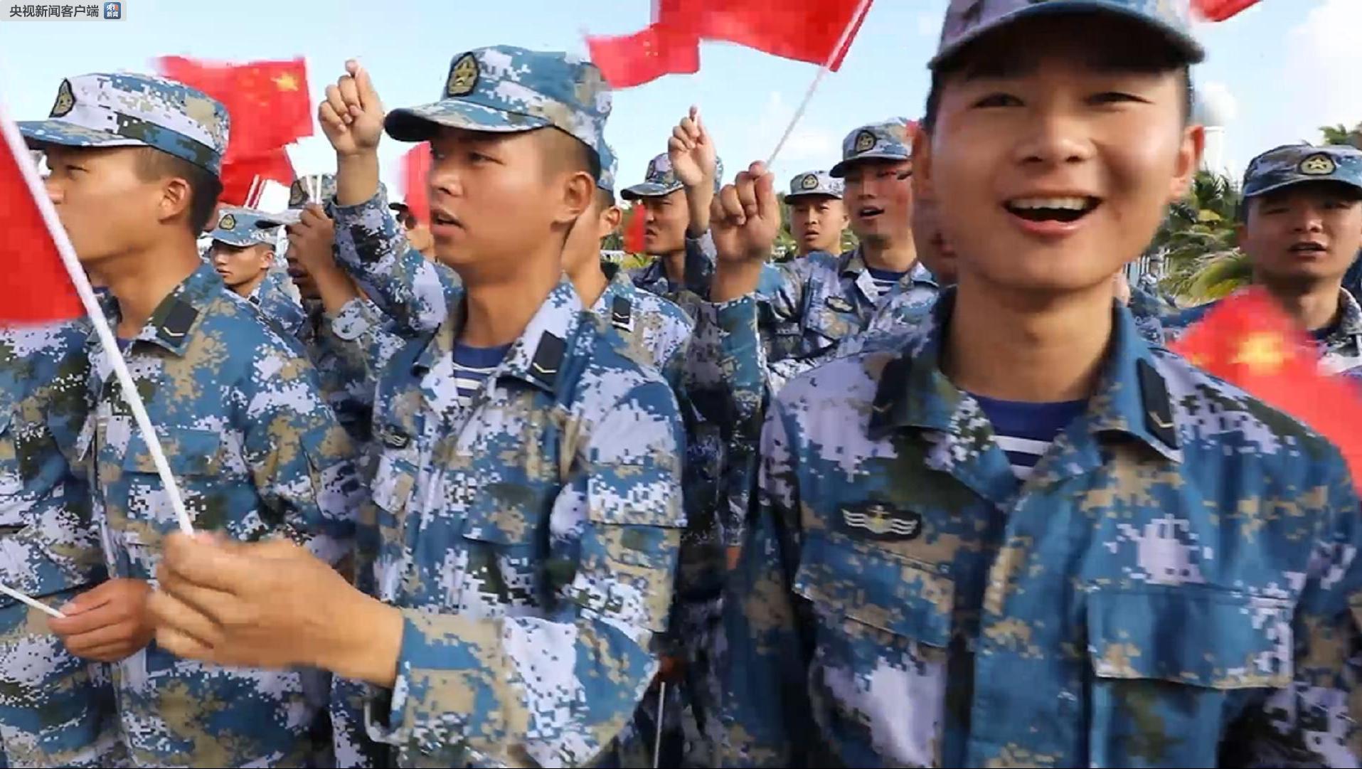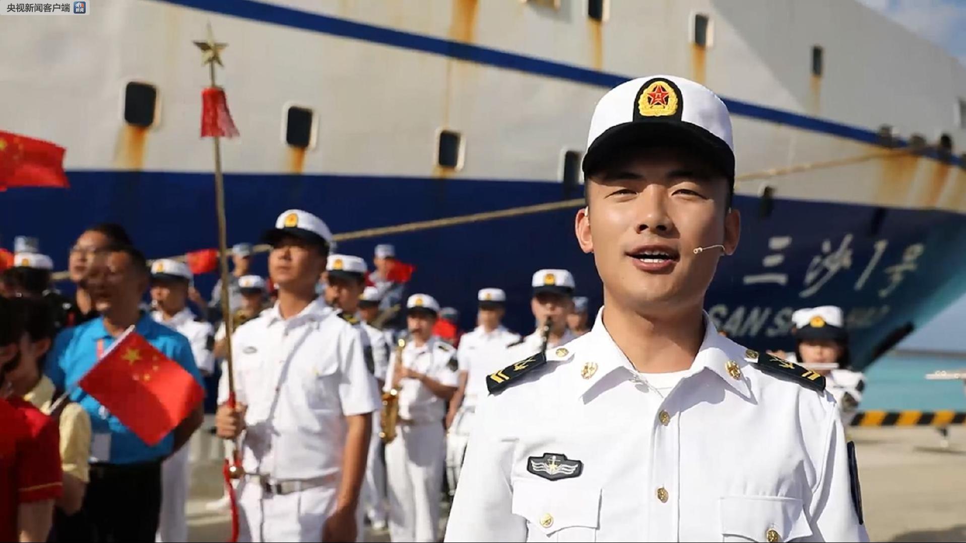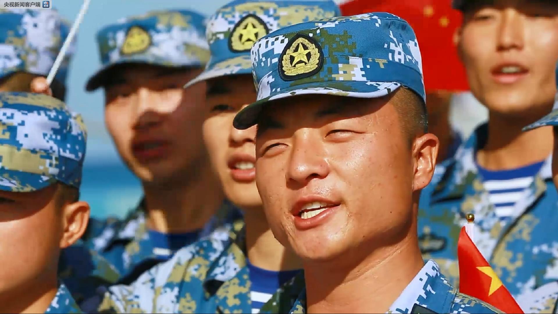“我和我的祖國,一刻也不能分割。無論我走到哪里,都流出一首贊歌!比澈\姂(zhàn)士李宗霖領(lǐng)唱歌曲。接著,三沙駐島戰(zhàn)士從遠處走來,齊聲高歌,意氣風發(fā)、豪情滿懷地歌唱,表達了對祖國的眷眷深情。