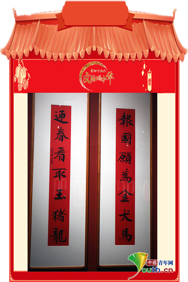 楹聯(lián)“報國愿為金犬馬,迎春看取玉豬龍”。中國青年網(wǎng)記者葉婉瑩 攝