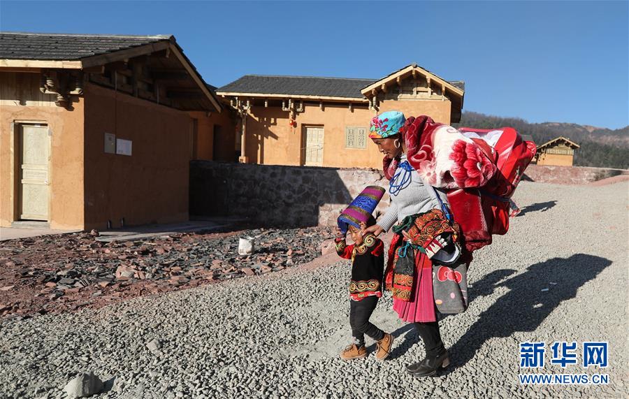 在昭覺縣三河村易地扶貧安置點(diǎn),馬海阿依帶著女兒搬進(jìn)新居(2月11日攝)。2月11日,三河村首批29戶、168人告別居住多年的土坯房,搬入易地扶貧安置點(diǎn)的新家。新華社記者 江宏景 攝