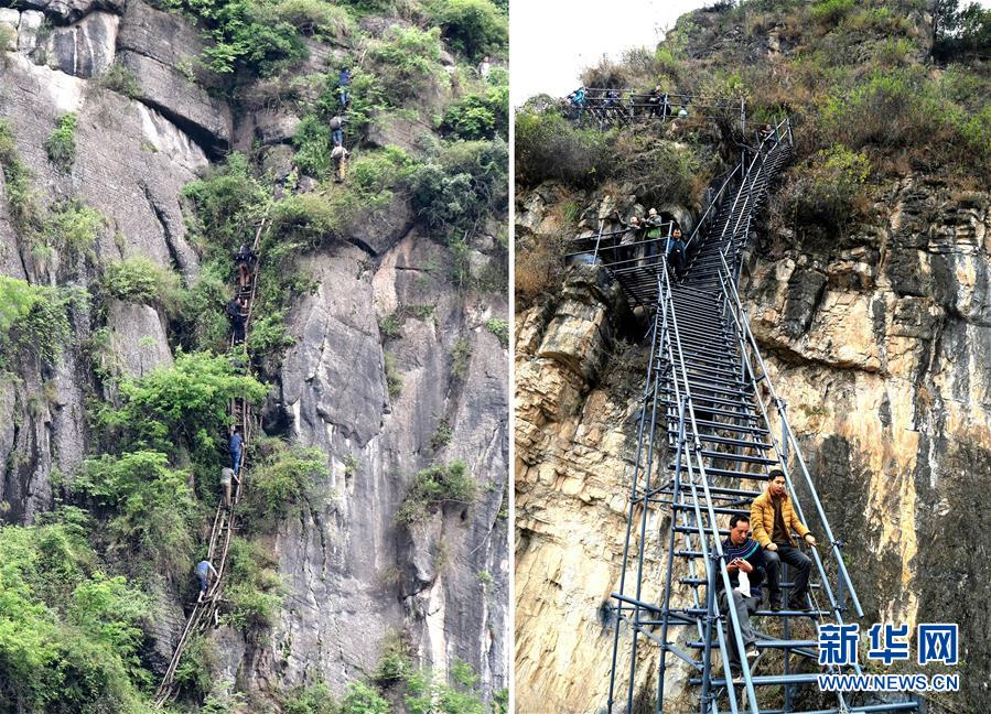 這是通往四川省涼山州昭覺縣阿土勒爾村的扶梯(左圖攝于2016年5月14日,右圖攝于2017年12月5日)。新華社發(fā)(阿克鳩射 攝)