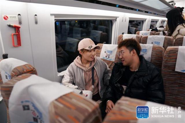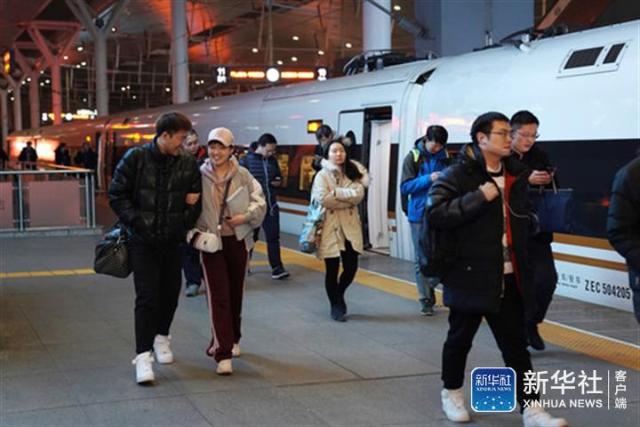↑2月22日晚,張世玉(左)與呂新在北京南站登上回天津的列車。