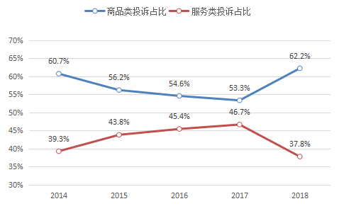 一是商品投訴比重擴大。2018年,全國市場監(jiān)管部門共受理商品投訴231.81萬件,占比62.2%,同比增長61.3%,服務投訴140.75萬件,占比37.8%,同比增長12.1%。商品投訴主要集中在日用百貨、食品、家用電器、交通工具、通訊器材等領域。服務投訴主要集中在遠程購物、居民服務、互聯(lián)網(wǎng)服務、文化娛樂服務、修理維護服務等領域。
