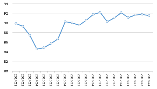 八是全國消費維權指數(shù)保持高位。2018年,全國消費維權指數(shù)平均為91.53,較去年同期增長了0.11個點,與五年平均值相比,增長了1.9個點。全國消費維權指數(shù)小幅增長,保持在高位,表明在我國經(jīng)濟總體平穩(wěn)、穩(wěn)中有進的發(fā)展態(tài)勢下,消費環(huán)境持續(xù)向好。