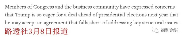 據(jù)路透社3月8日報道,美國國會議員和商界人士擔(dān)心特朗普為了在明年的大選中獲勝,急于跟中國達成貿(mào)易協(xié)議,懷疑他可能接受一項未能真正解決問題的協(xié)議。對此,白宮貿(mào)易顧問威萊姆斯否認(rèn)稱,擔(dān)心特朗普接受一項糟糕的對華貿(mào)易協(xié)議是“完全錯誤的”。