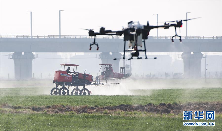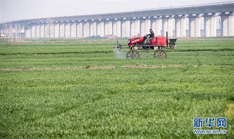3月16日,在湖北省襄陽市襄州區(qū)的10萬畝小麥綠色高質(zhì)高效示范區(qū),農(nóng)業(yè)技術(shù)推廣人員進(jìn)行病蟲害機(jī)械化綠色綜合防控作業(yè)。新華社記者 肖藝九 攝