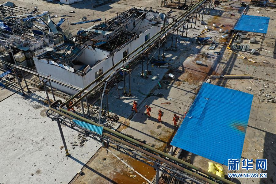 3月22日,消防隊員在江蘇鹽城響水化工廠爆炸事故現場搜救(無人機拍攝)。 新華社記者 季春鵬 攝