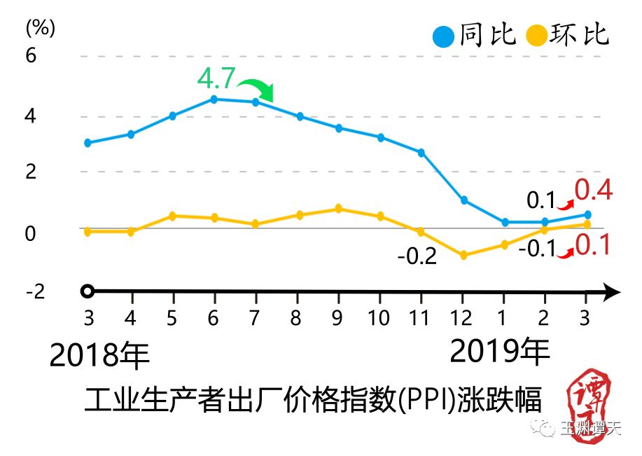 看看3月份的工業(yè)品價格(就是所謂的工業(yè)生產(chǎn)者出廠價格指數(shù)),這個指數(shù)同比上漲0.4%,環(huán)比漲了0.1%,說明工業(yè)領(lǐng)域的價格正在回升。