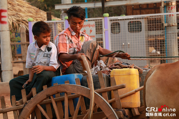 皎勃東地區(qū)的村民趕著牛車(chē)來(lái)中緬油氣管道項(xiàng)目援建的水井打水(洪荃詮 攝)