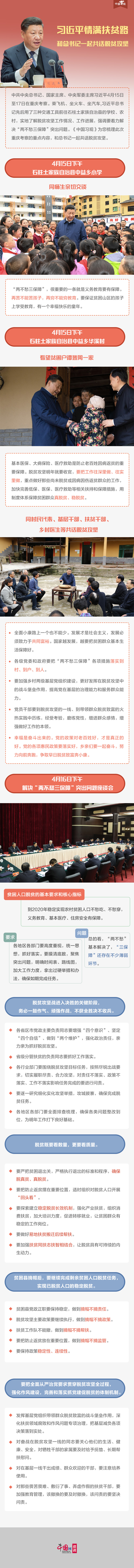 4月15日至17日,習(xí)近平總書記在重慶考察,主持召開解決“兩不愁三保障”突出問題座談會并發(fā)表重要講話,對扎實做好今明兩年脫貧攻堅工作作出重要部署,對著力解決“兩不愁三保障”突出問題提出明確要求。