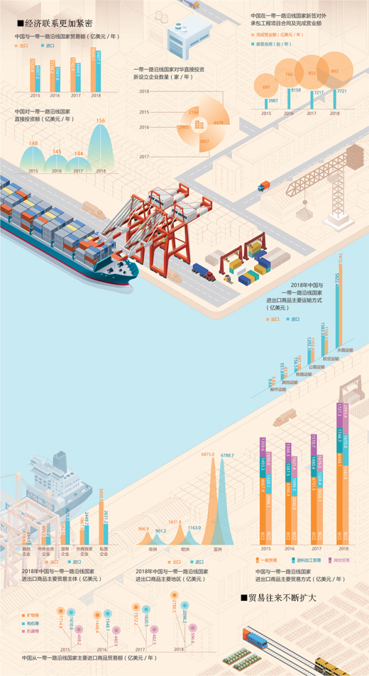 目前,我國已與126個國家和29個國際組織簽署“一帶一路”合作文件,“六廊六路多國多港”合作為主線的硬聯(lián)通國際合作不斷深入。我國企業(yè)在“一帶一路”沿線國家建設(shè)了一批境外經(jīng)貿(mào)合作區(qū),累計投資超過300億美元,帶動東道國就業(yè)近30萬人,給當?shù)仄胀癖妿韺崒嵲谠诘墨@得感。2013年至2018年,我國與“一帶一路”沿線國家貨物貿(mào)易總額超過6萬億美元,我國企業(yè)對“一帶一路”沿線國家直接投資超過900億美元。