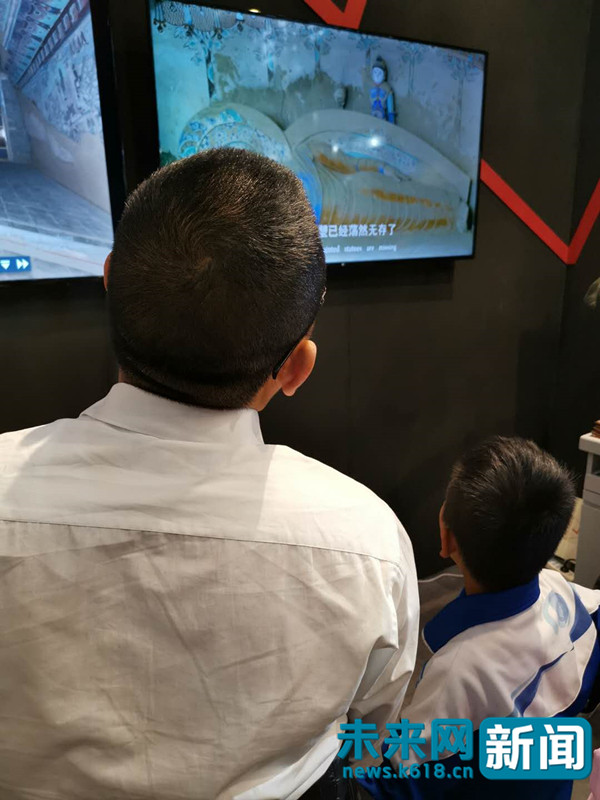 在國家文物局展區(qū),來自福州的王先生帶著兒子通過VR、虛擬技術(shù)體驗敦煌文化,兒子在一旁認真觀看,并一直問個不停,看得不亦樂乎。王先生告訴未來網(wǎng)(教育公眾號ID:newsk618)記者,通過虛擬體驗感覺就像是身臨其境,這樣的形式孩子更容易接受。他還帶著孩子體驗了良渚博物館、上海博物館。