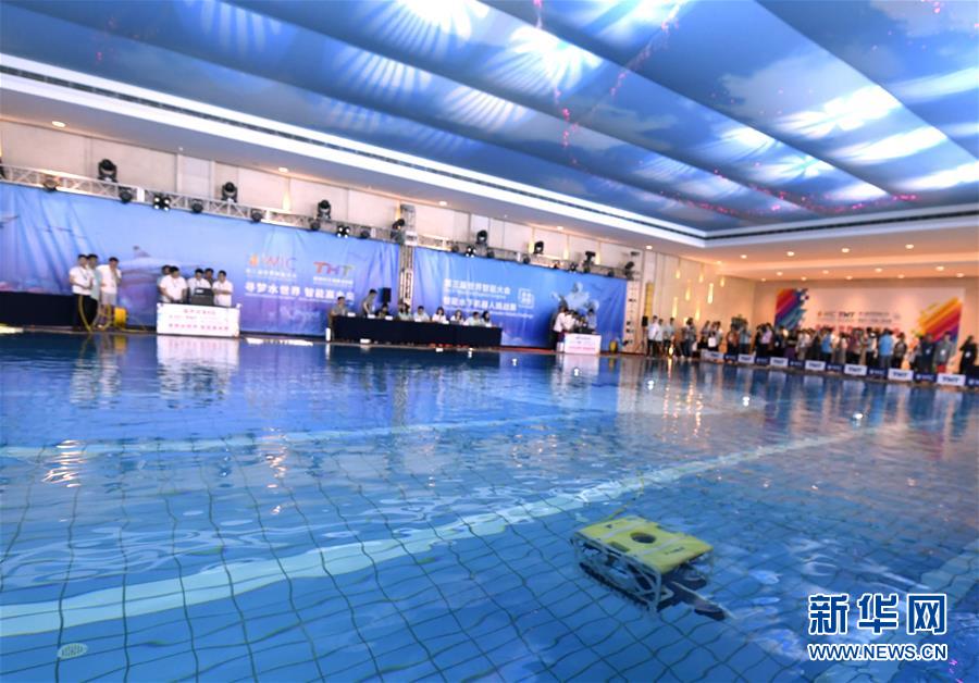5月15日,在2019世界智能水下機(jī)器人挑戰(zhàn)賽上,來自墨爾本大學(xué)和悉尼大學(xué)聯(lián)合參賽隊(duì)的水下機(jī)器人接近信息源。 新華社記者 岳月偉 攝