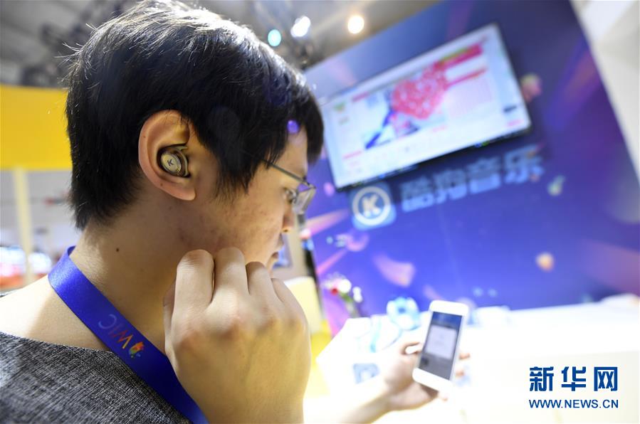 5月16日,在第三屆世界智能大會(huì)智能科技展上,觀眾使用酷狗音樂耳機(jī)進(jìn)行“語音點(diǎn)歌”。 新華社記者 岳月偉 攝