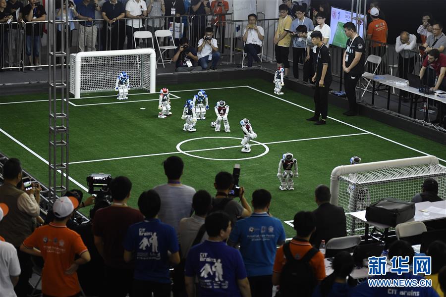 5月17日,在2019亞太機(jī)器人世界杯天津國際邀請賽中,觀眾在觀看機(jī)器人踢足球。 新華社記者 岳月偉 攝