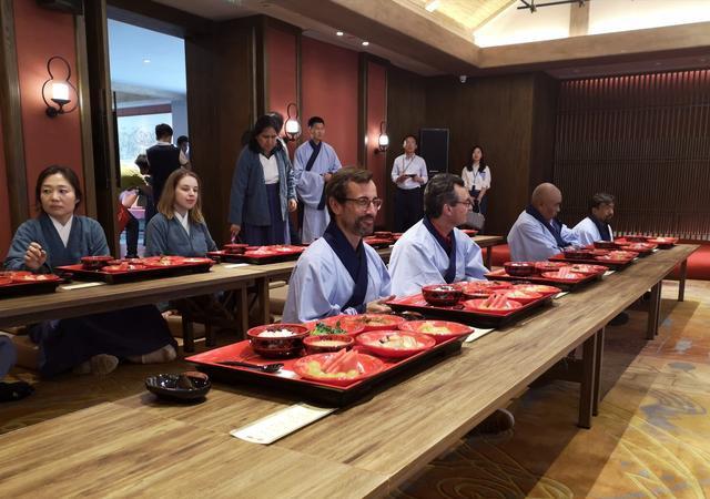 陳福、請(qǐng)?bào)纭⒅x福、敬天地、進(jìn)餐……5月17日中午,在曲阜尼山書院酒店,身著漢服的外國(guó)友人體驗(yàn)了尼山食禮。“以前是通過書本了解到儒家文化,這次來山東,才真正感受到儒家文化的博大精深!边M(jìn)餐時(shí),烏茲別克斯坦記者創(chuàng)作聯(lián)合會(huì)副主席霍穆羅德·薩利莫夫拿出手機(jī)記錄了整個(gè)過程,他要帶去回給家人觀看。稍晚,外國(guó)友人來到在孔府、孔廟參觀,大家一邊聆聽講解員介紹,一邊拍照留念。
