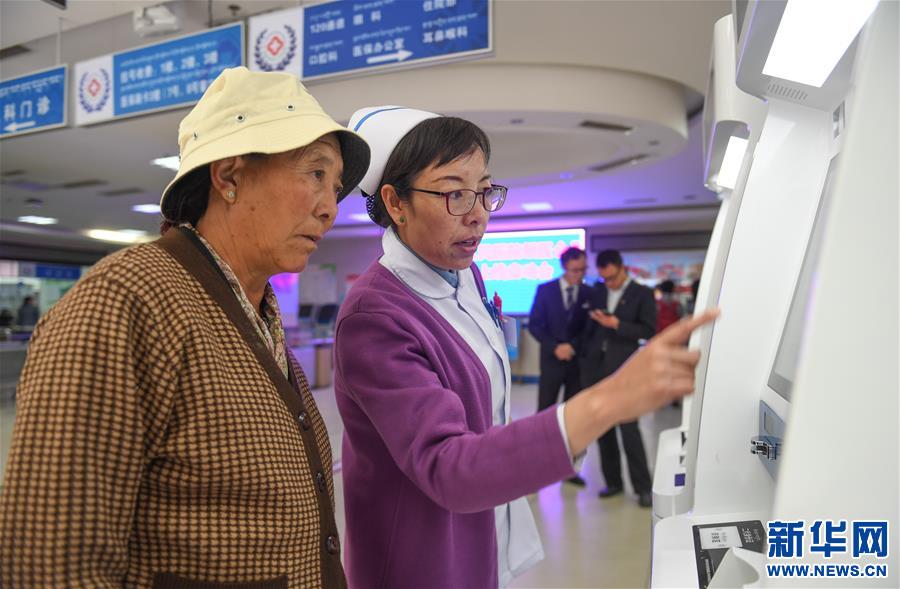 5月26日,西藏自治區(qū)人民醫(yī)院工作人員在為患者講解多功能自助機(jī)的功能。新華社記者 張汝鋒 攝