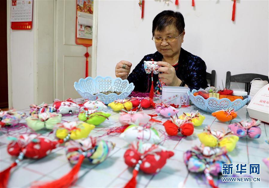 6月3日,在江蘇省蘇州市金閶街道,居民季國琴老人制作虎頭香囊。 端午將至,人們參加多彩民俗活動迎接傳統(tǒng)節(jié)日的到來。 新華社發(fā)(杭興微 攝)