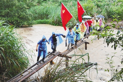 6月13日,參加“記者再走長征路”主題采訪活動的記者們,在江西于都縣祁祿山沿著當(dāng)年中央紅軍長征走過的“紅軍小道”冒雨行進(jìn),體驗紅軍穿越深山峽谷的艱苦行程! ∠目到 郭智勇攝影報道