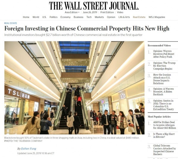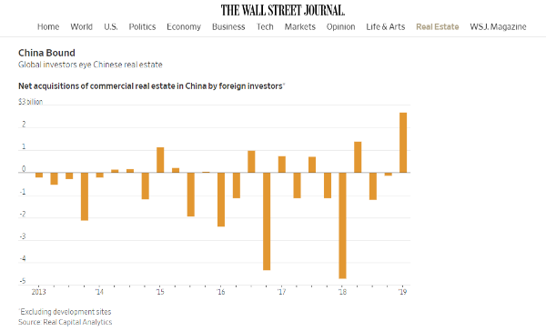 外資對(duì)中國商業(yè)地產(chǎn)投資創(chuàng)新高。圖片來源:《華爾街日?qǐng)?bào)》報(bào)道截圖
