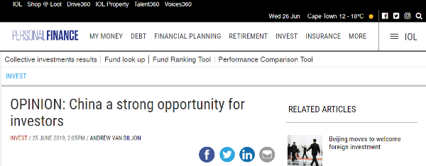 另據(jù)南非獨(dú)立新聞網(wǎng)6月25日?qǐng)?bào)道,南非金融機(jī)構(gòu)RisCura分析師安德魯·范比利翁(Andrew van Biljon)認(rèn)為,盡管中美貿(mào)易關(guān)系持續(xù)緊張,但中國政府的政策和積極的市場(chǎng)變化,能夠確保投資中國是一個(gè)良機(jī)。