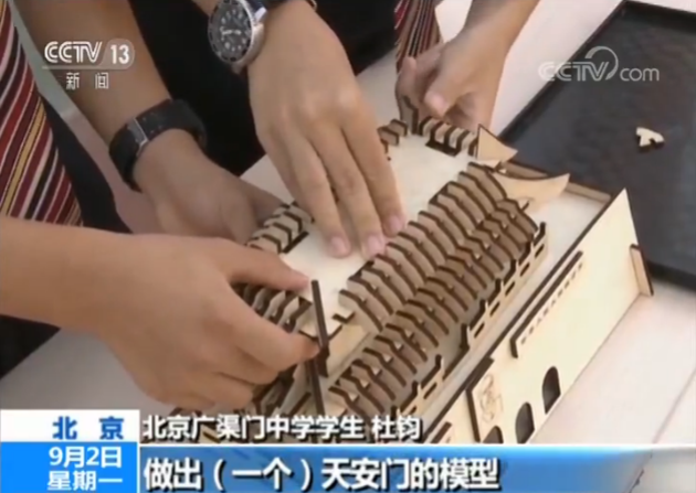 北京廣渠門中學學生 杜鈞:暑假的時候,我和我的同學用激光切割技術做出一個天安門的模型。今年是新中國成立70周年,這也是我們祝福祖國的一種心意。