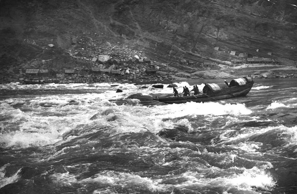1883年3月,英國冒險(xiǎn)家阿奇博爾德·立德雇用木船進(jìn)入三峽,行至西陵峽,木船被激流沖向江心,岸上拖船的纖夫被繩索拉著,撞向巖石,一死一傷。