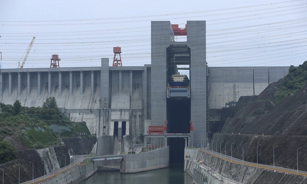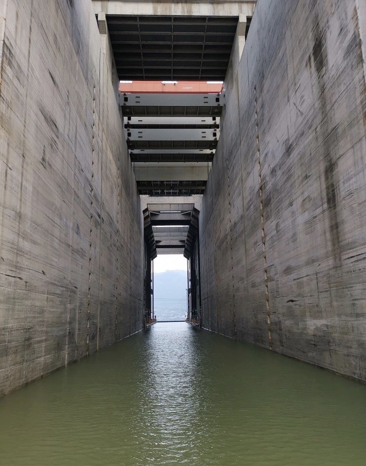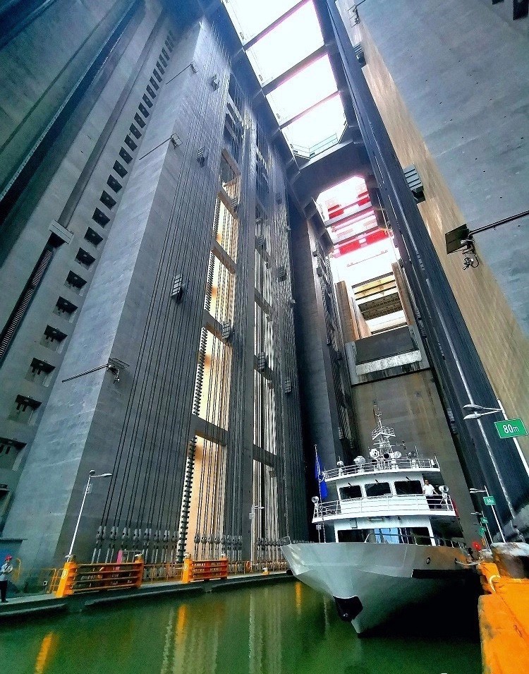 海巡艇從百米高大壩上坐“電梯”下降