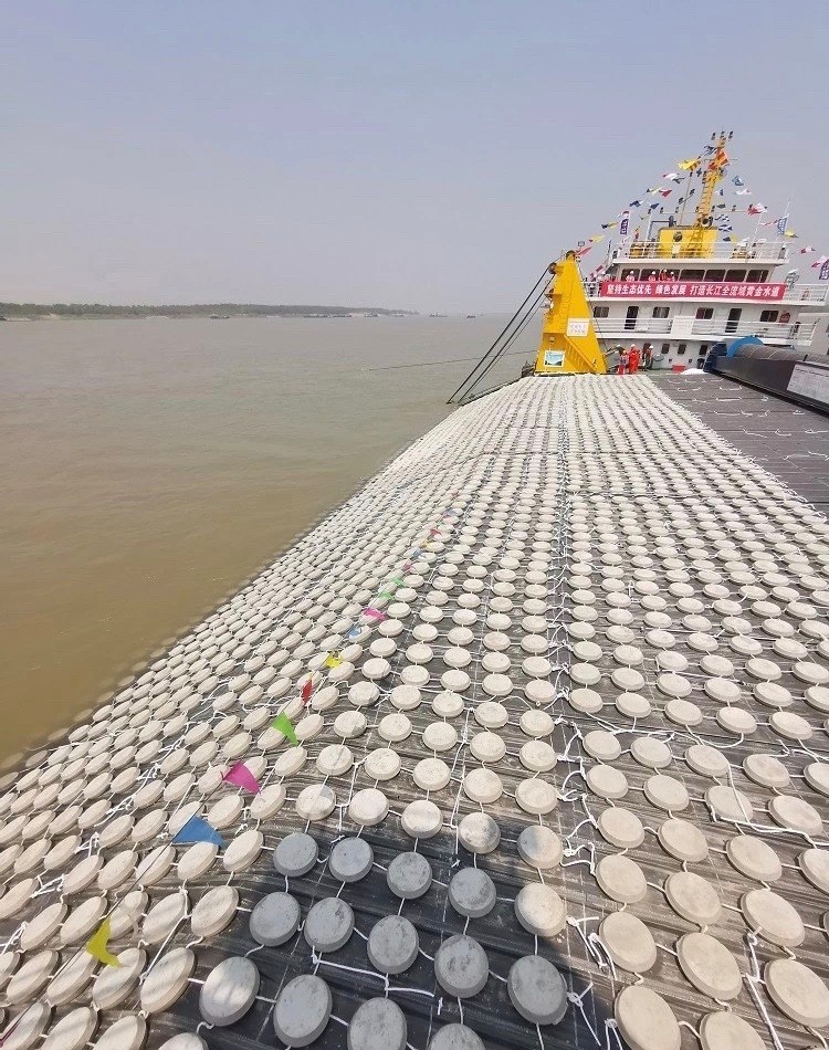 《志遠(yuǎn)讀城》乘海巡艇,來到鄂州江段的戴家洲水道整治現(xiàn)場,看到了熱火朝天的立體施工圖景:岸上工程,采取生態(tài)化鋼絲網(wǎng)格、生態(tài)護(hù)坡磚等生態(tài)護(hù)岸結(jié)構(gòu),實(shí)現(xiàn)陸上植被和河岸景觀的較快恢復(fù);灘上工程,則用生態(tài)固灘技術(shù),重建了灘上植被,整個(gè)工程用的草籽就有十多種;水下工程,為了控制住水中“流動(dòng)的沙丘”,采用50年不腐爛的無紡布,并在上面拴滿30公斤重的水泥預(yù)制塊,用專用鋪排施工船沉放到江底,穩(wěn)固河床。人們形象地稱之為在江底“鋪地磚”。