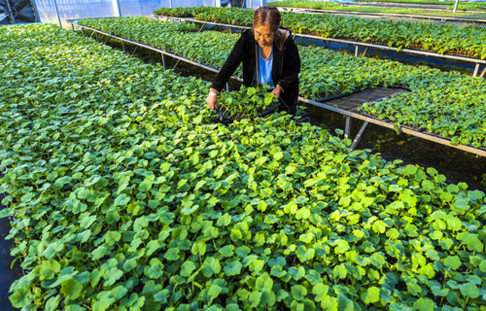 9月27日,河北省衡水市武邑縣興彪蔬菜種植專業(yè)合作社農(nóng)民在育苗大棚內(nèi)打理秧苗。近年來,河北省衡水市武邑縣在脫貧攻堅(jiān)中依托區(qū)域蔬菜瓜果生產(chǎn),大力推廣蔬菜集約化育苗技術(shù),全縣已建成年育苗能力1000萬株以上的集約化育苗基地5家,農(nóng)民可根據(jù)種植需求與基地簽訂30余種蔬菜種苗的育苗合同。目前,該縣年培育優(yōu)質(zhì)瓜菜秧苗近1億株,集約化育苗率達(dá)90???,帶動(dòng)當(dāng)?shù)剞r(nóng)民實(shí)現(xiàn)增收。新華社記者 李曉果 攝