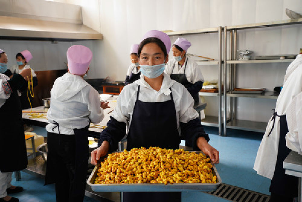 在甘肅省臨夏回族自治州東鄉(xiāng)族自治縣高山鄉(xiāng)布楞溝村一扶貧基地,趙阿英社展示她制作的特色面食——花馃馃(8月29日攝)。 34歲的趙阿英社在這家加工特色面食“花馃馃”的扶貧基地工作一年多了,每月有2000元的收入。布楞溝村在東鄉(xiāng)語中意為“懸崖邊”。如今,這個(gè)深貧村有了連通全村的脫貧路,扶貧車間、扶貧基地紛紛出現(xiàn),很多農(nóng)村婦女從田頭進(jìn)入車間。新華社記者 陳君清 攝