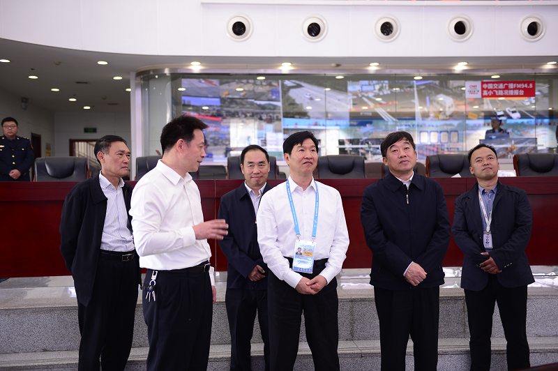 交通運(yùn)輸部副部長(zhǎng)劉小明(前排左二)在湖北省交通運(yùn)輸廳廳長(zhǎng)朱漢橋(前排左三)的陪同下,來(lái)到湖北省高速公路應(yīng)急處置服務(wù)中心檢查指導(dǎo)工作。(央廣網(wǎng)發(fā) 詹楓 攝)