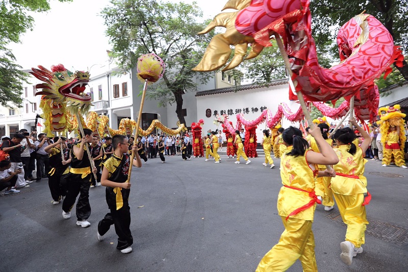快閃結(jié)束后,由荔灣社會(huì)各界相關(guān)代表組成的約400人的舞龍舞獅、戲曲等方陣隊(duì)伍,從恩寧路永慶坊二期巡游到永慶坊一期,進(jìn)入永慶坊、粵劇藝術(shù)博物館廣福臺(tái)廣場(chǎng),展現(xiàn)了粵劇粵曲、“三雕一彩一繡”等嶺南特色非遺項(xiàng)目。