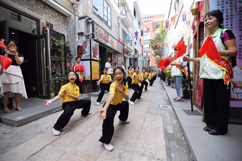 24日下午,在廣州粵劇藝術(shù)博物館、永慶坊等歷史建筑周邊拉開(kāi)了一場(chǎng)快閃活動(dòng)。一群身穿粵劇衣服的小朋友們甩著水袖、踏著蓮步出場(chǎng);顒(dòng)首先在粵劇藝術(shù)博物館普樂(lè)天廣場(chǎng)前拉開(kāi)序幕,由來(lái)自荔灣區(qū)青少年宮的小演員們表演原創(chuàng)曲目《小小水袖展芳菲》,現(xiàn)場(chǎng)吸引了眾多游客。其余四個(gè)快閃地點(diǎn)分別為鑾輿堂、李小龍祖居、八和會(huì)館、永慶坊二期金聲廣場(chǎng)。來(lái)自粵劇藝術(shù)博物館少兒傳承基地的小演員和荔灣區(qū)五眼橋小學(xué)的學(xué)子也參與了快閃表演,包括粵劇、武術(shù)、紅歌表演等。