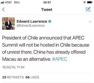 。ㄖ抢偨y(tǒng)宣布因為騷亂不在智利舉辦APEC峰會,中國提議澳門作為備選)“中國提議到澳門去簽協(xié)議”,是真是假?