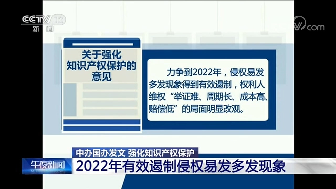 央視網(wǎng)消息:近日,中共中央辦公廳、國(guó)務(wù)院辦公廳印發(fā)了《關(guān)于強(qiáng)化知識(shí)產(chǎn)權(quán)保護(hù)的意見(jiàn)》(以下簡(jiǎn)稱《意見(jiàn)》)并發(fā)出通知,要求各地區(qū)各部門結(jié)合實(shí)際認(rèn)真貫徹落實(shí)。