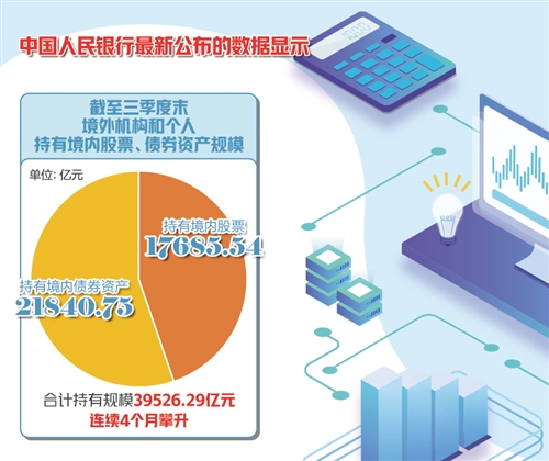 中國人民銀行最新公布的數(shù)據(jù)顯示,截至三季度末,境外機構和個人持有境內(nèi)股票、債券資產(chǎn)規(guī)模分別達到17685.54億元和21840.75億元,合計持有規(guī)模39526.29億元,已連續(xù)4個月攀升,并創(chuàng)下歷史新高。