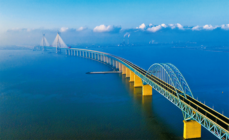 滬通長(zhǎng)江大橋連接江蘇省張家港市和南通市,是我國(guó)“八縱八橫”高鐵網(wǎng)中沿海鐵路大通道的咽喉工程,是目前世界上最大跨徑的公鐵兩用大橋。這一工程規(guī)模大、標(biāo)準(zhǔn)高、難度大,代表著當(dāng)前中國(guó)乃至世界同類型橋梁建設(shè)的最高水平。2019年9月20日,滬通長(zhǎng)江大橋成功合龍。圖為無(wú)人機(jī)拍攝的水天一色滬通長(zhǎng)江大橋全景。 人民圖片 丁曉春/攝