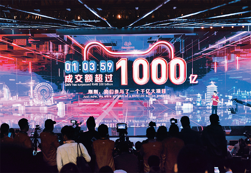 市場(chǎng)是決定資源配置的基礎(chǔ),為推動(dòng)經(jīng)濟(jì)發(fā)展提供內(nèi)生動(dòng)力,強(qiáng)大國(guó)內(nèi)市場(chǎng)是我國(guó)經(jīng)濟(jì)發(fā)展的獨(dú)特優(yōu)勢(shì)。圖為2019年11月11日,在浙江杭州阿里巴巴西溪園區(qū)媒體中心,大屏幕顯示1小時(shí)3分59秒阿里巴巴平臺(tái)上的成交額沖破1000億元人民幣。 新華社記者 黃宗治/攝