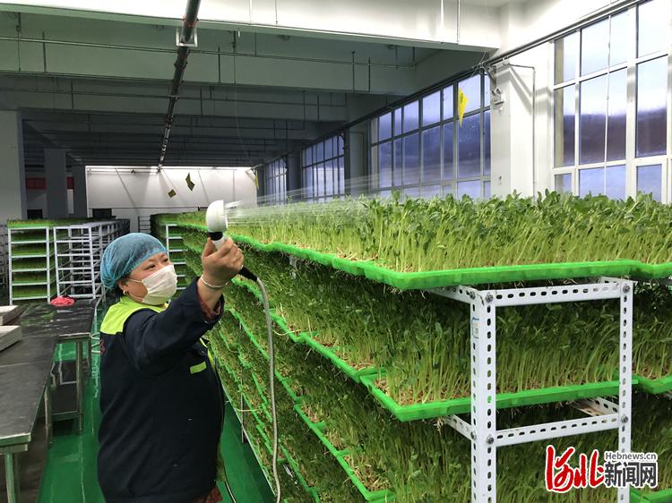 52歲的燕明慧身著藍(lán)綠相間的工作服、頭戴防塵帽,嫻熟地穿梭在一人多高的置物架間,舉著噴壺給一排排芽苗噴水。細(xì)流所到處,水珠滾動(dòng),一盤盤綠油油的小麥苗、蕎麥苗、豌豆苗煞是喜人。